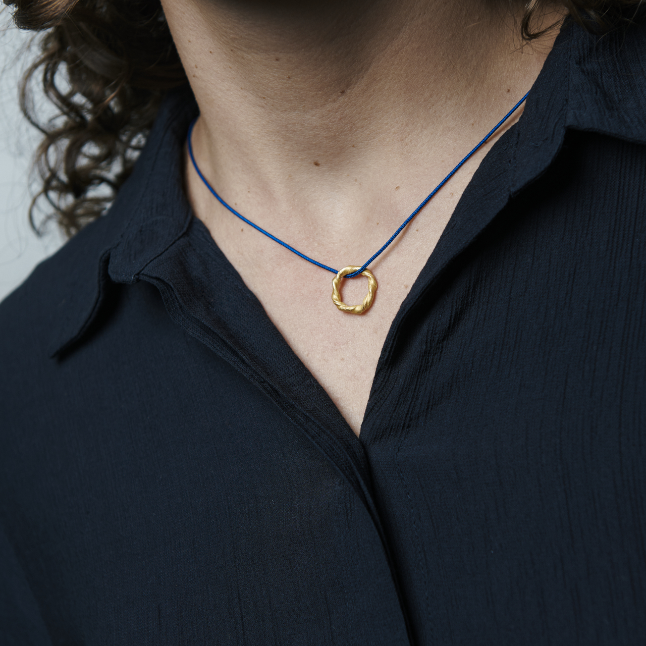 Anhänger gedreht in 900/- Gold an farbigem Baumwollband. Auf Wunsch auch an Goldketten erhältlich: Dafür gilt der Preis auf Anfrage je nach Stärke und Länge der Kette.