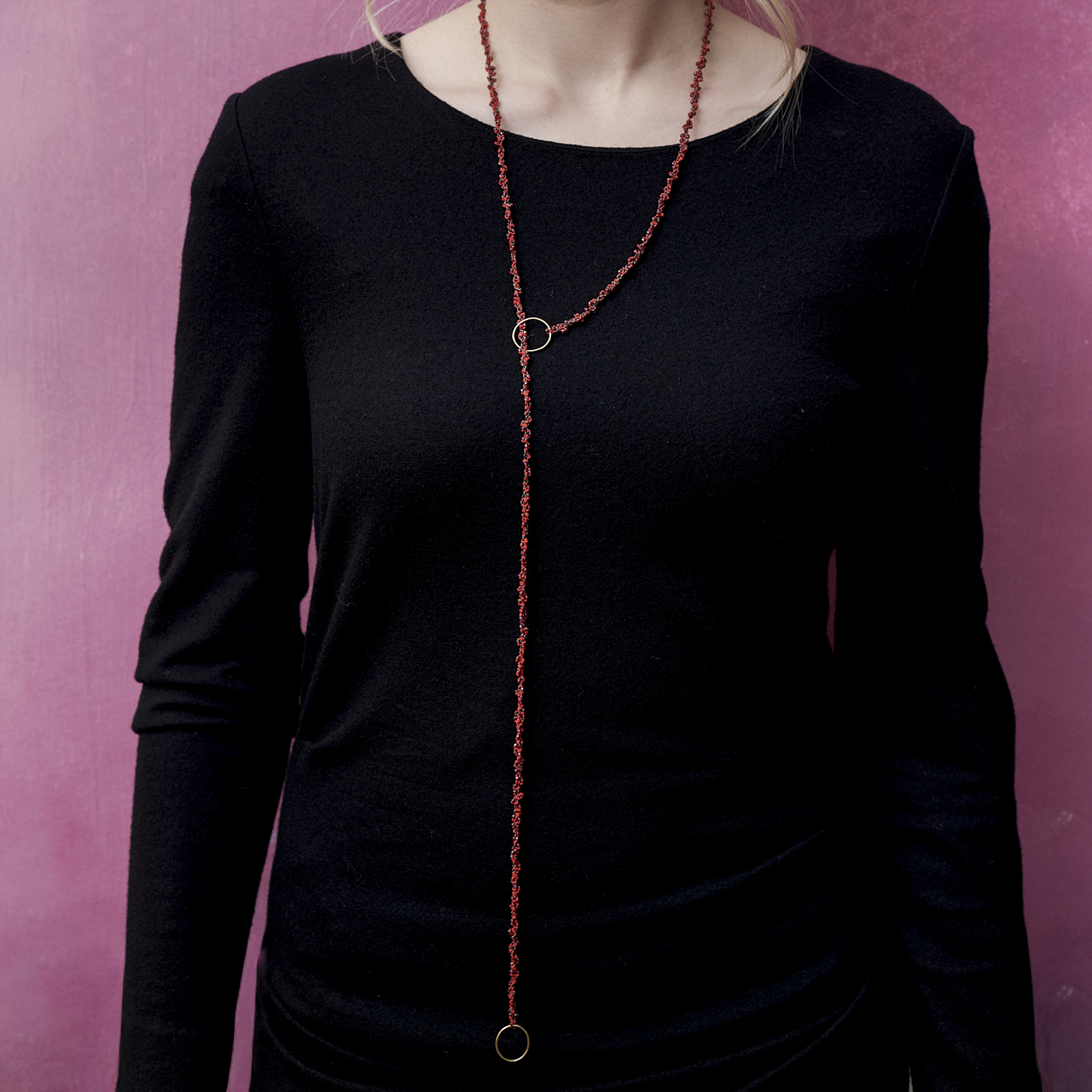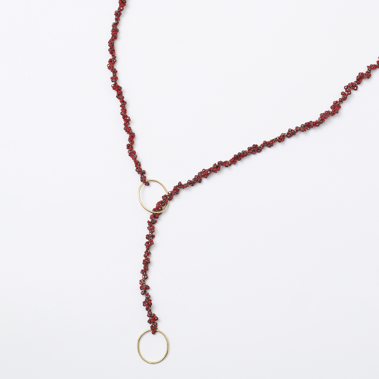 Halsschmuck „Border“ Rot mit 2 ovalen Endösen in 750/- Gelbgold, geschwärzten Silberösen, Granaten und roter Seide