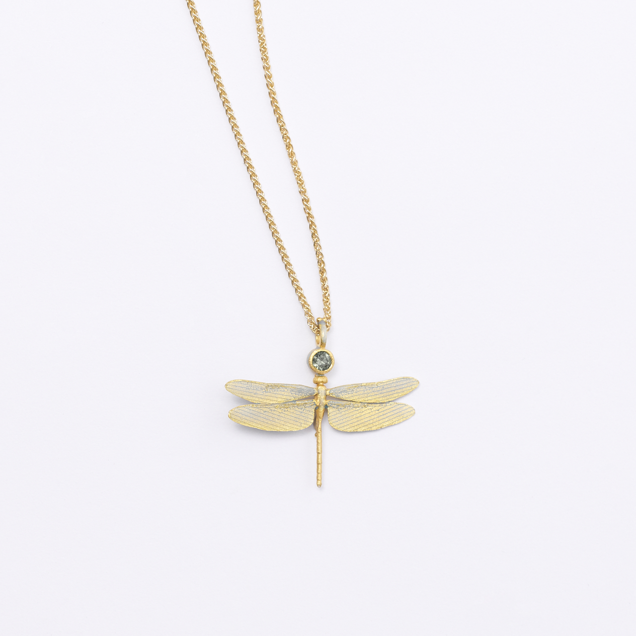 Collier Libelle opalisierend emailliert in 900/- Gold mit einem grünen Granat an einer Zopfkette aus 750/- Gelbgold (45cm) *356