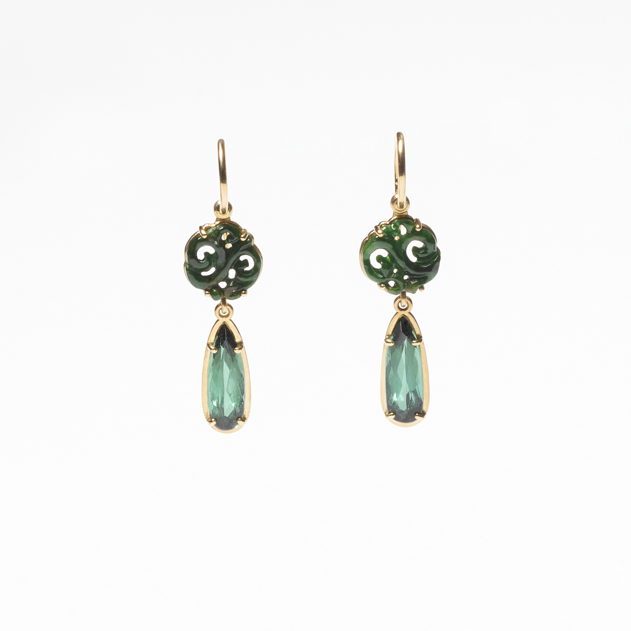 Ohrhänger in 750/- Gelbgold mit geschnitzter runder dunkelgrüner Jade und grünen Turmalintropfen