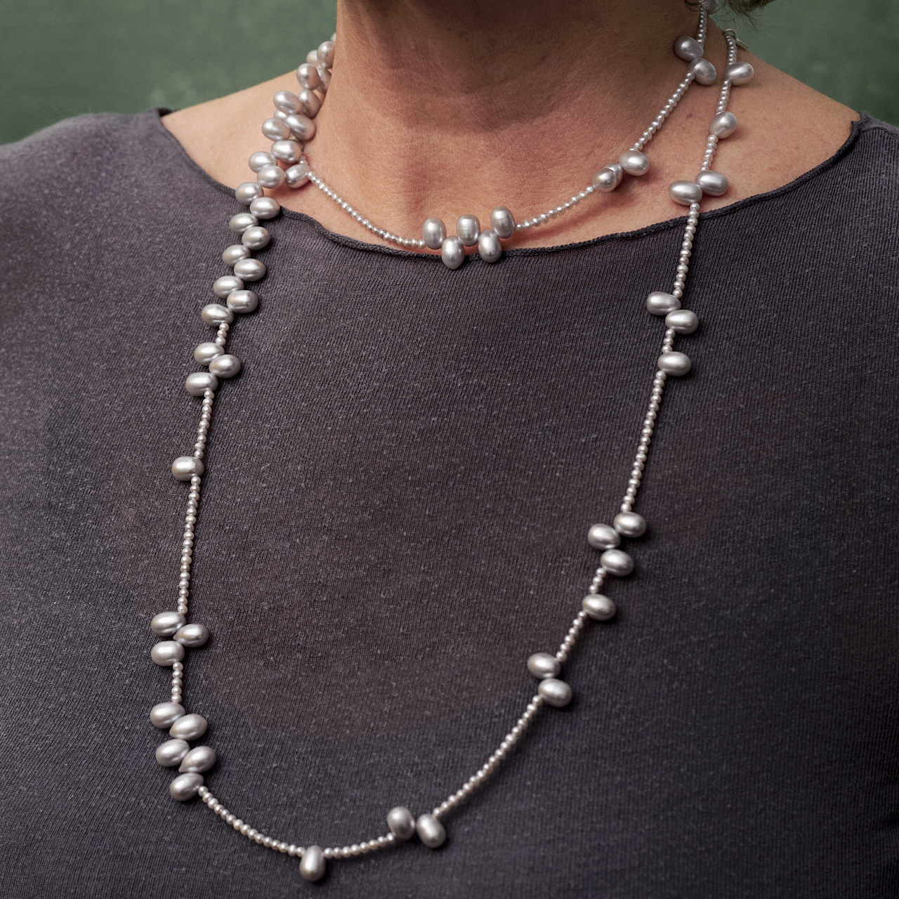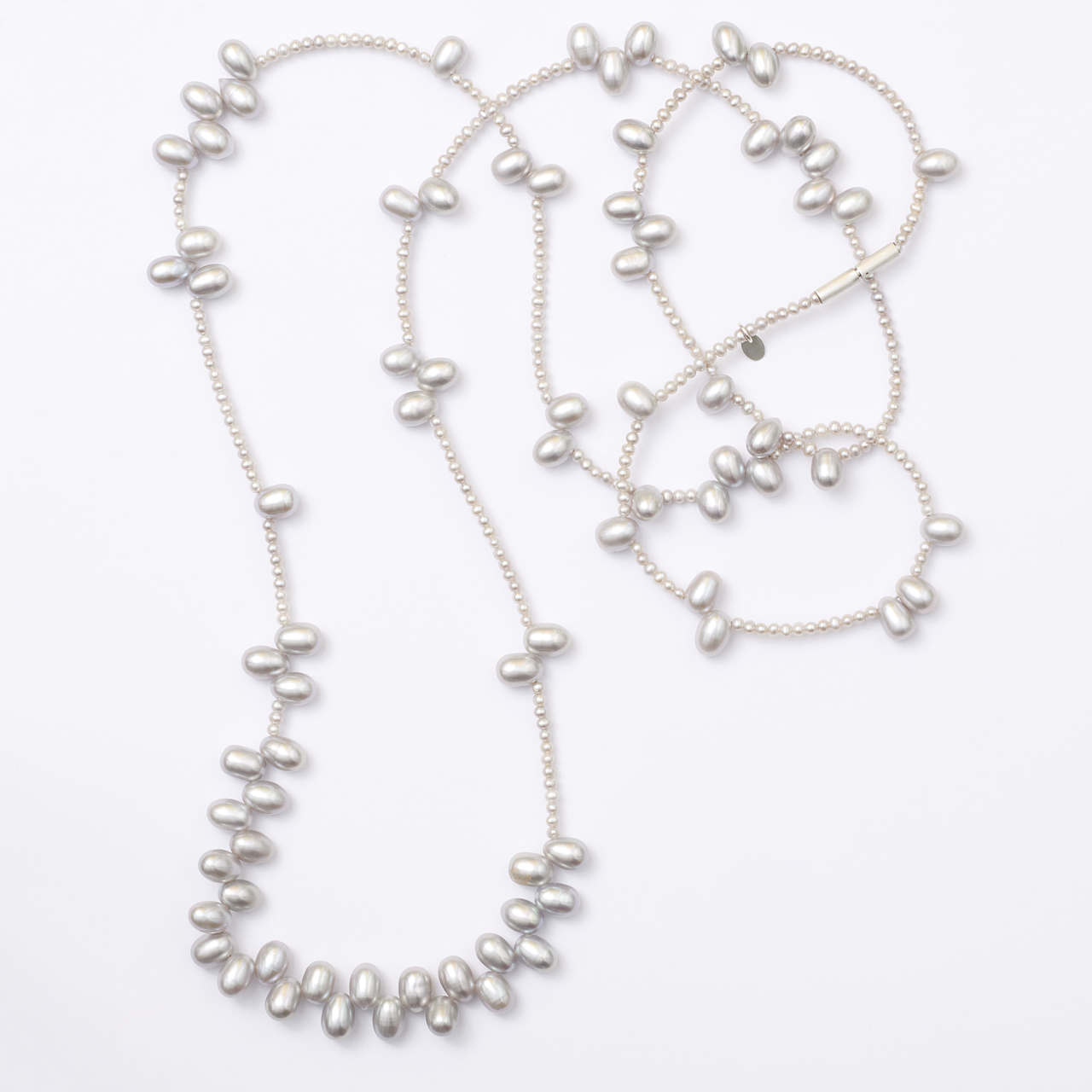 Perlkette „Tropfenspiel“ lang in 925/-Silber mit hellgrauen Süßwasserzuchtperltropfen und Süßwasserzuchtperlen