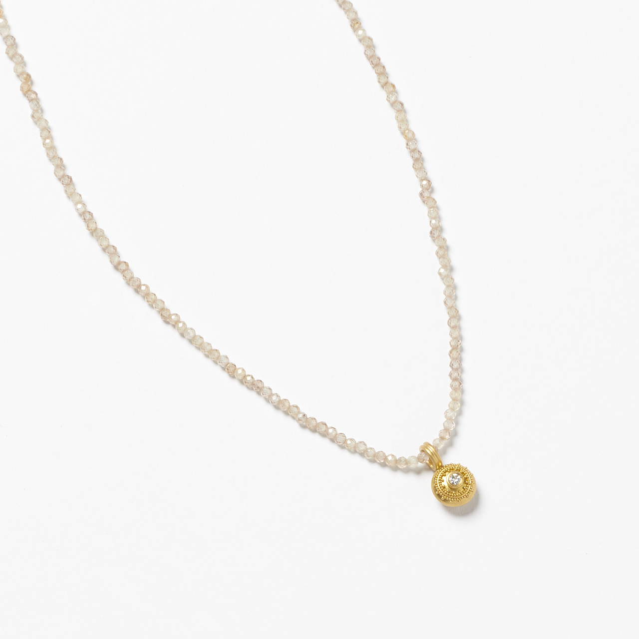 Granulierter Linsenanhänger 8mm in 900/- Gold mit einem Brillant 0,03ct tw/vvs an einer Zirkonkette mit handgefertigtem S-Haken in 750/- Gelbgold