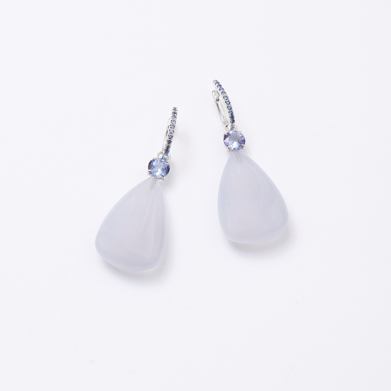 Creolen gerade in 750/-Weißgold mit 22 blauen Saphiren und Einhänger mit 2 Chalcedonen und 2 Tansaniten gefasst in 750/-Weißgold