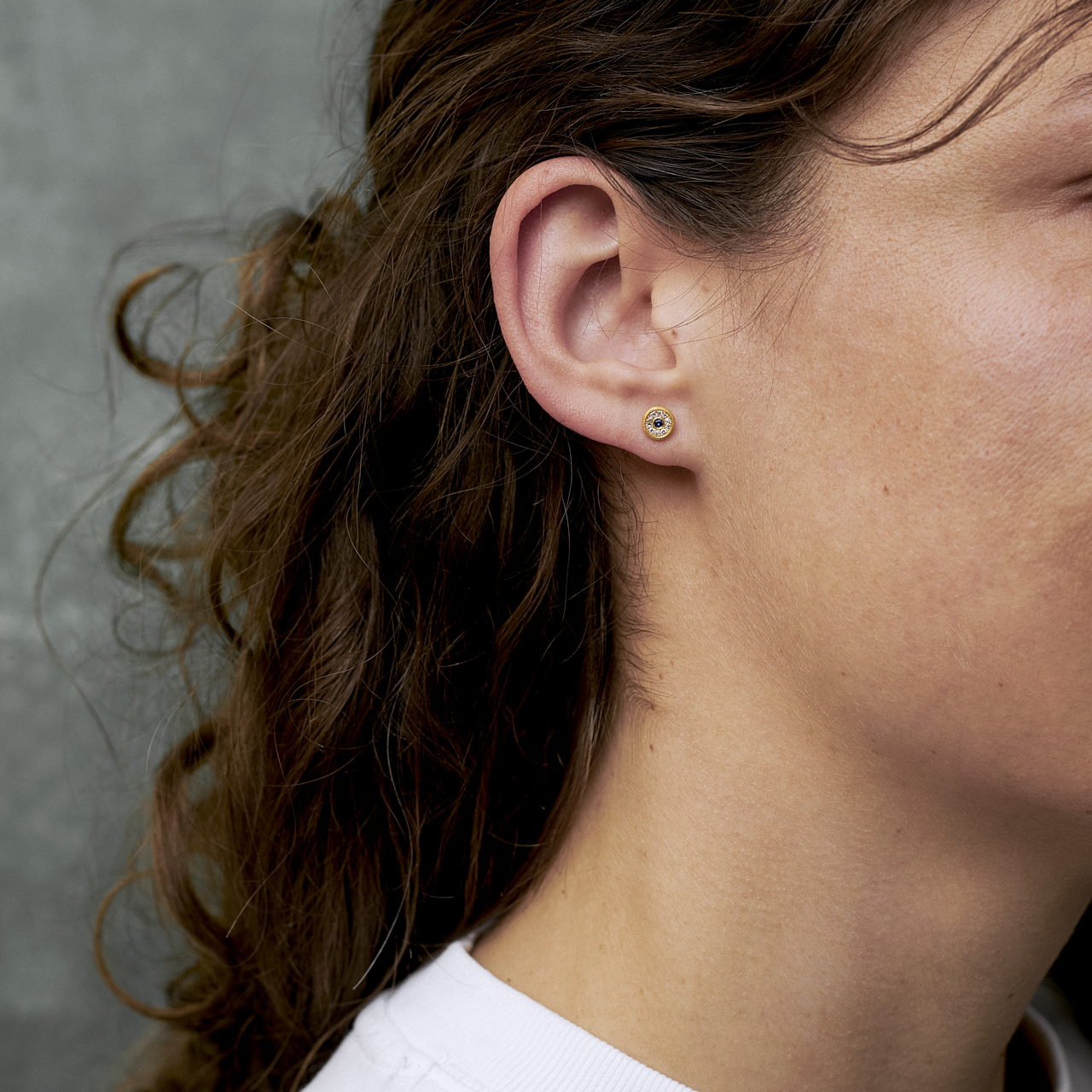 Ohrstecker Scheibe 6mm ausgefasst mit 2 Saphiren und 20 Diamanten 0,11ct in 900/- Gold